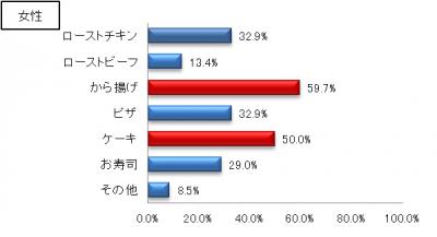 一方、女性に対して、クリスマスなどに自宅で作る料理を質問したところ、1位になったのは「から揚げ」で6割弱の59.7%もの人が答えました。続いて2位に入ったのは、男性と同じく「ケーキ」で50.0%でした。男性で1位に選ばれた「ローストチキン」は「ピザ」とともに3位、32.9%でした。
